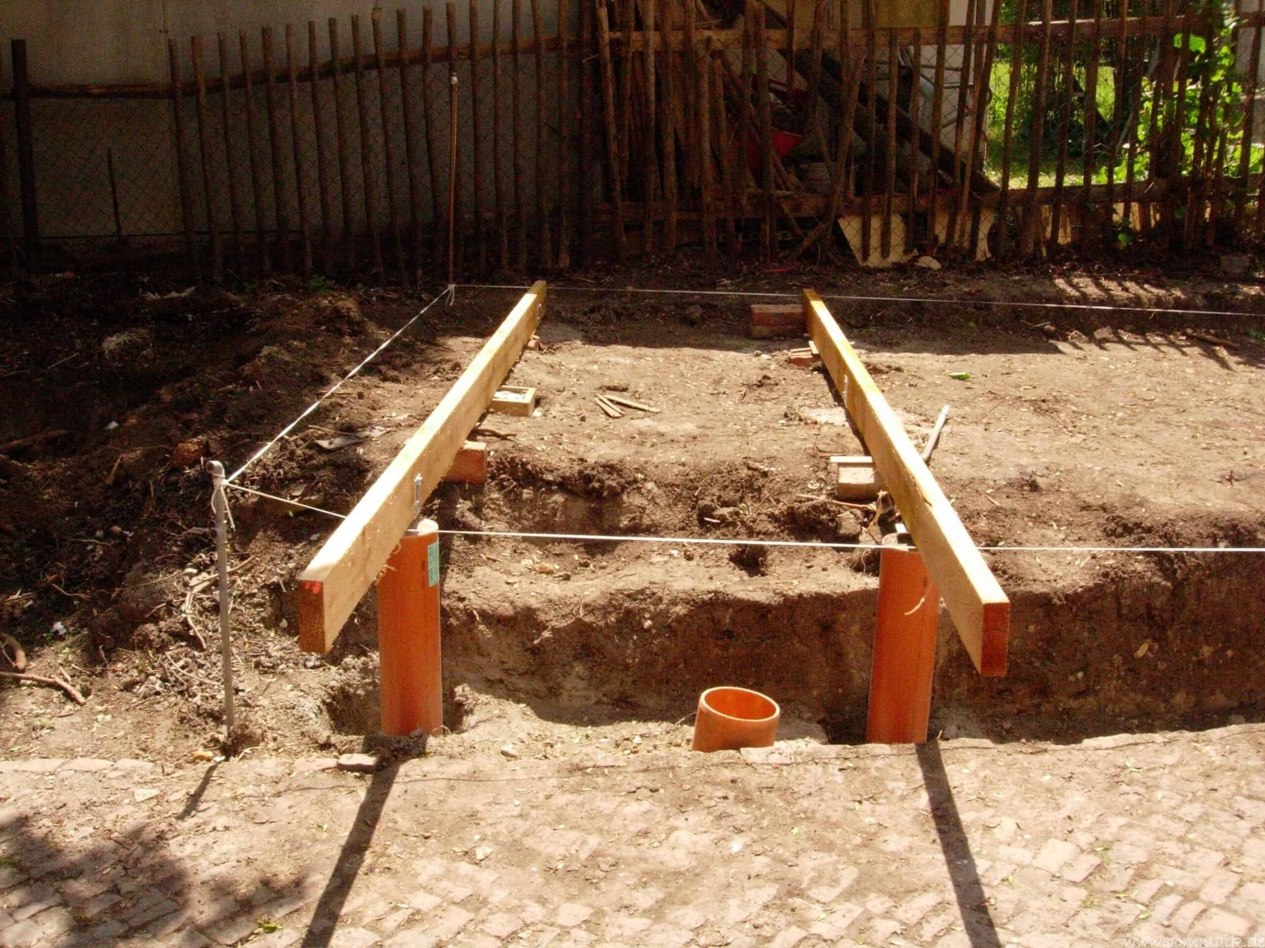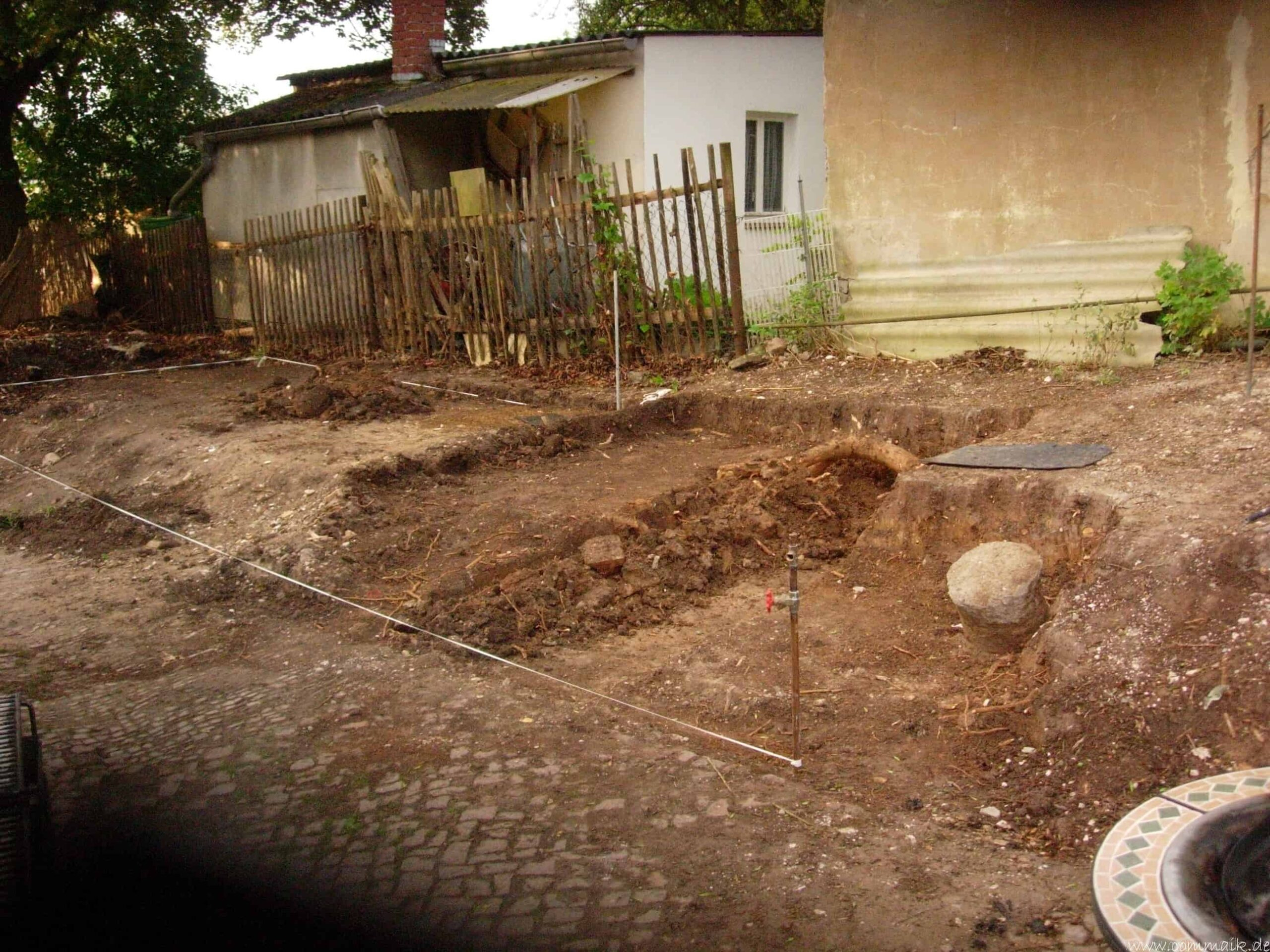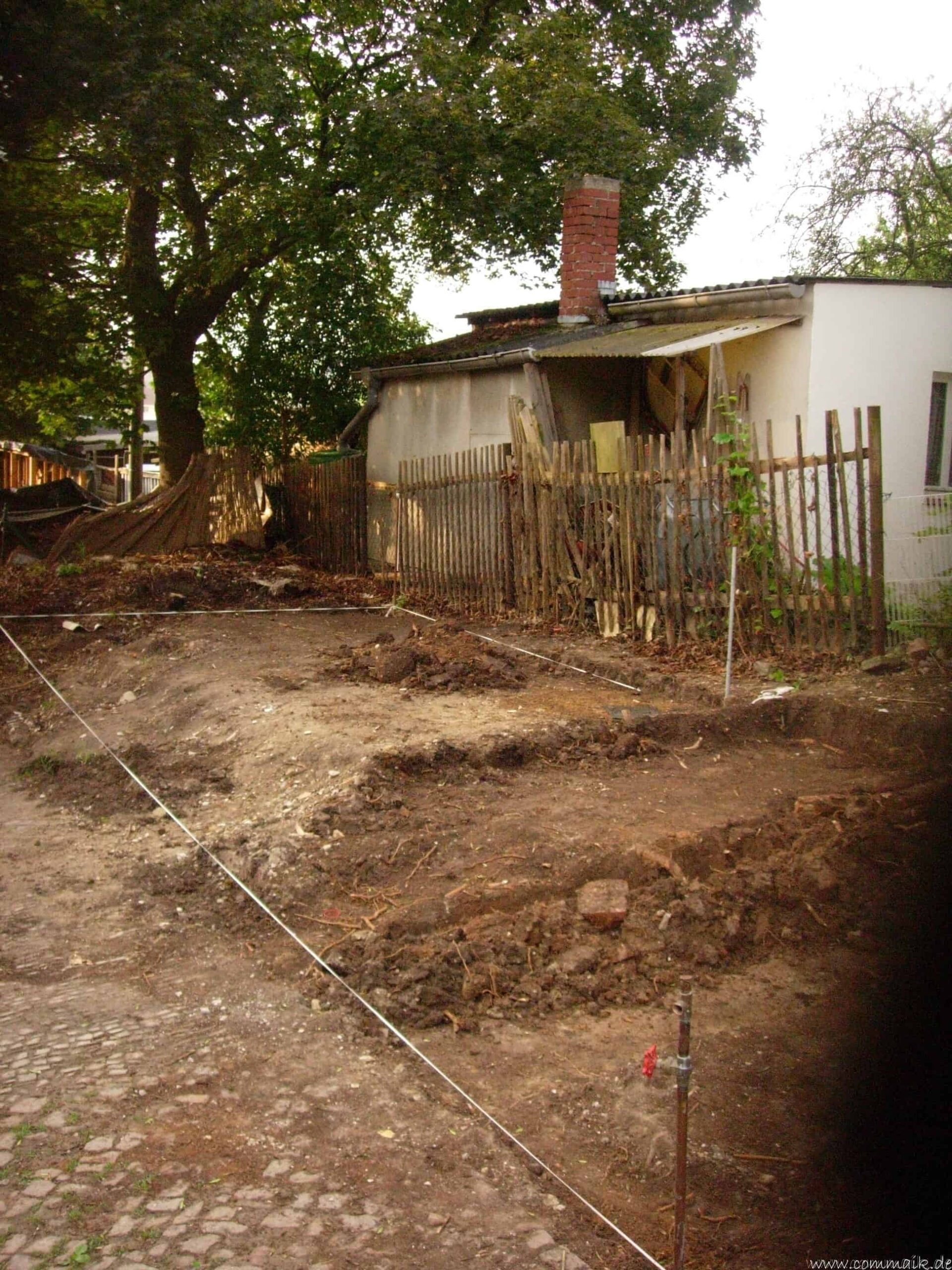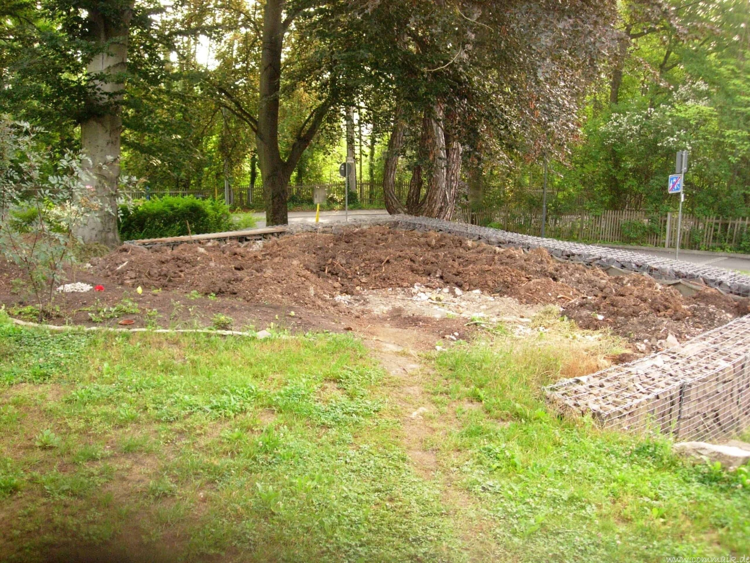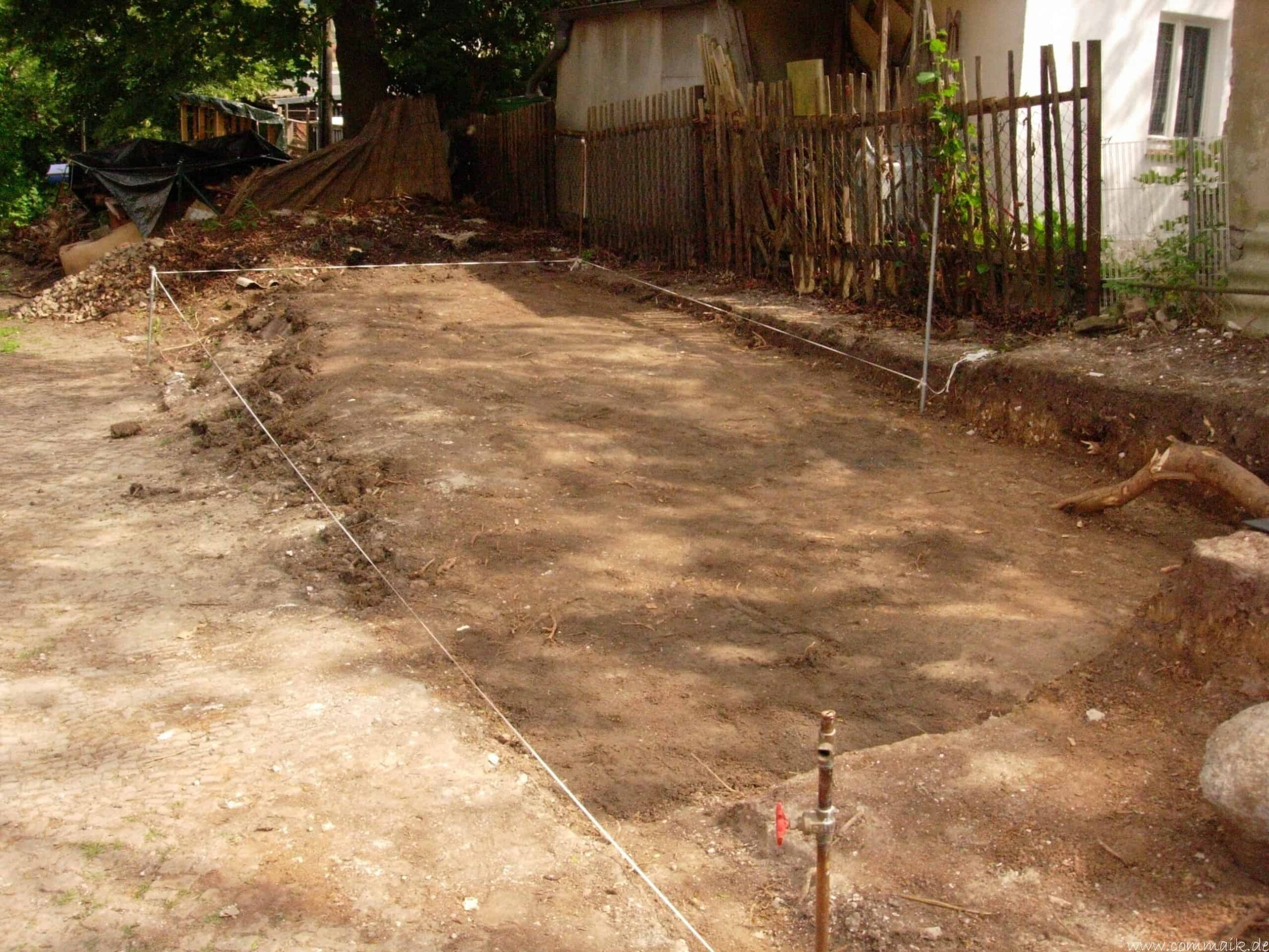 Durch die vielen kleinen Büsche und Heckenpflanzen und natürlich auch den Baum war das Erdreich sehr stark durchwurzelt. Effektiv haben wir mehr mit der Axt als der Schaufel gegraben. Eine Richtschnur grenzte die Grundfläche zunächst ein und gab einen groben Ansatz zur Einebnung. Kurioser Weise stellte sich heraus das wir auf ca. 15m Länge ein Gefälle von 2cm erbuttelt hatten – das ganze zunächst aber nur nach Sicht und ohne techn. Hilfsmittel.