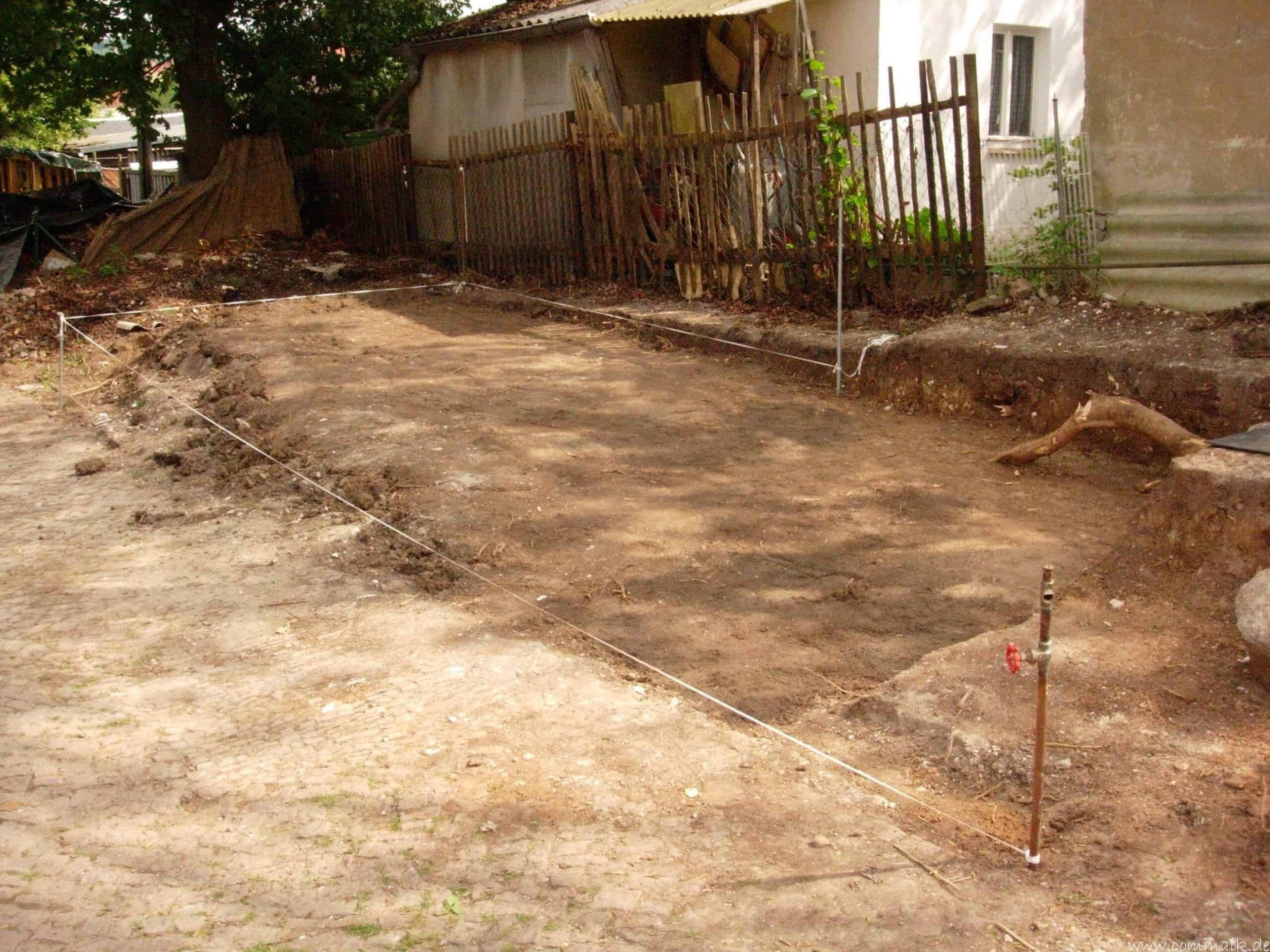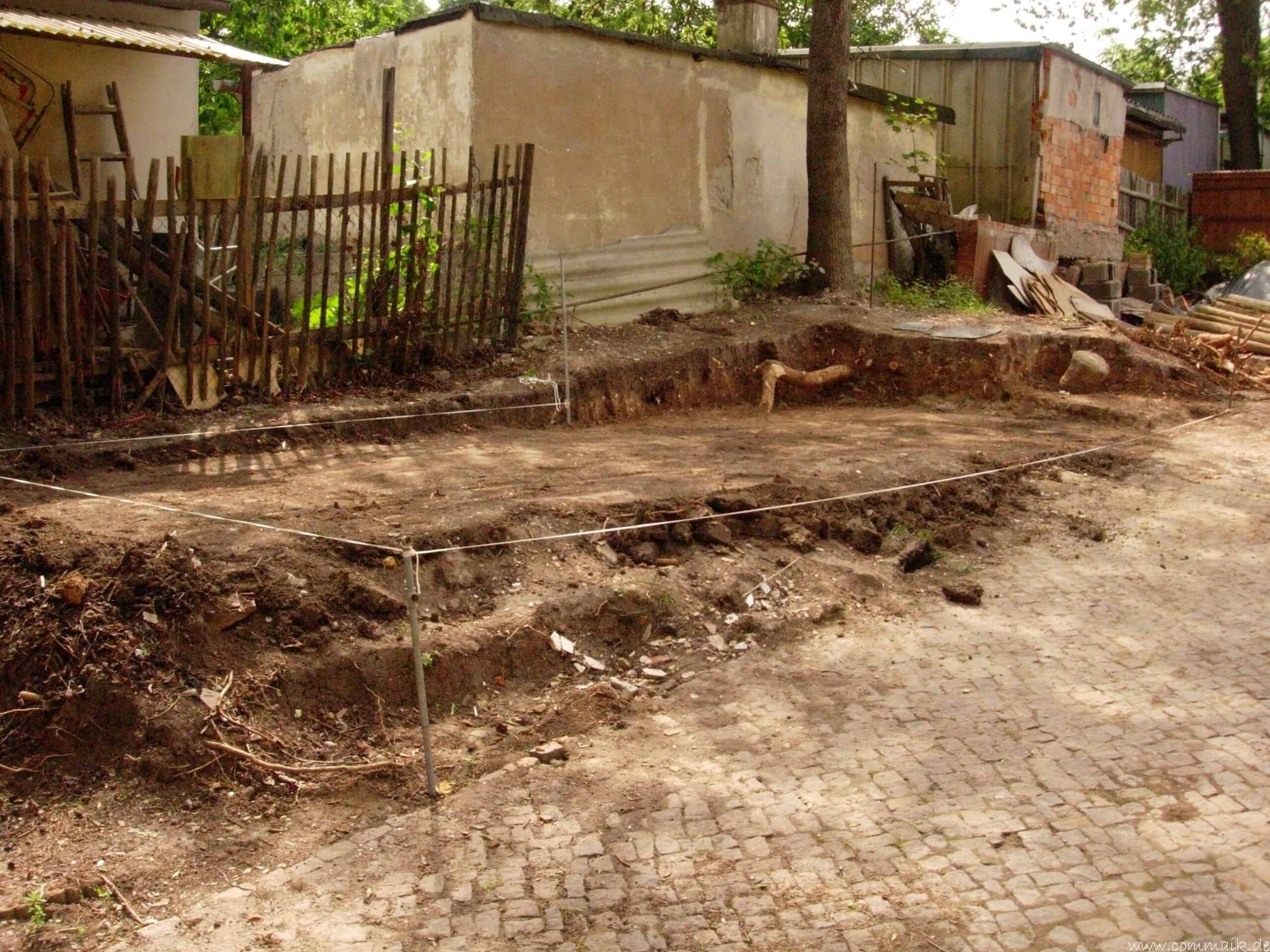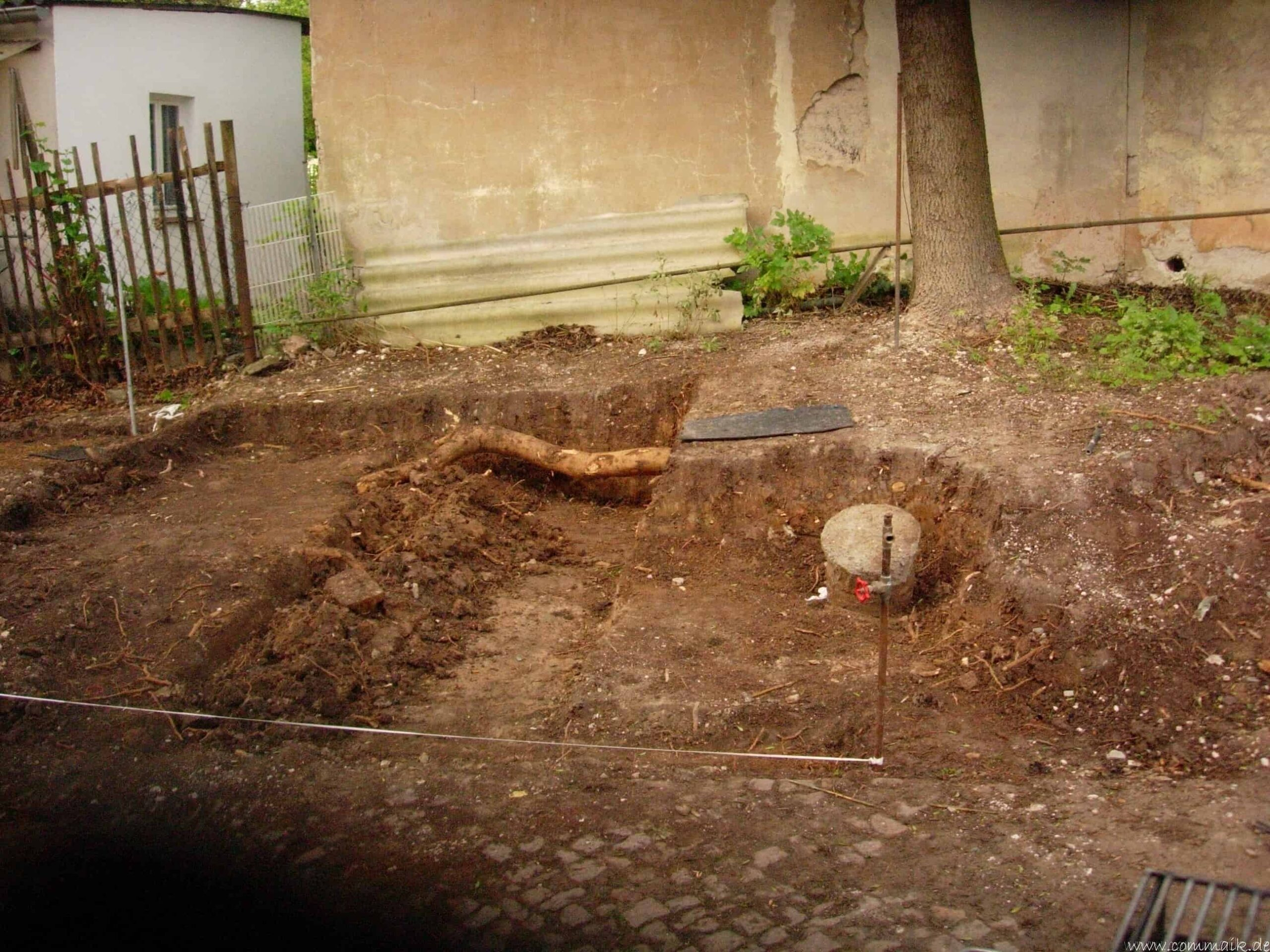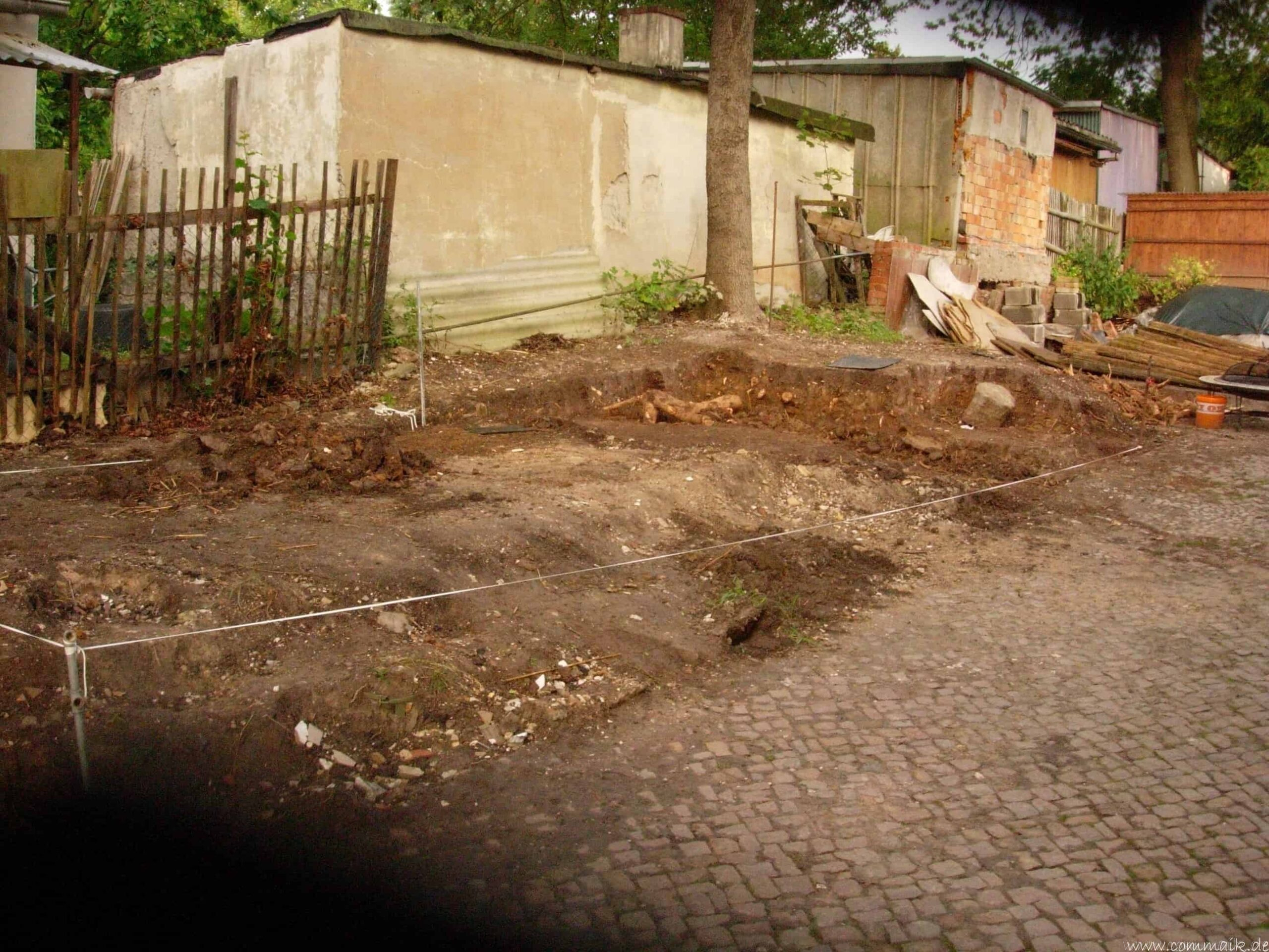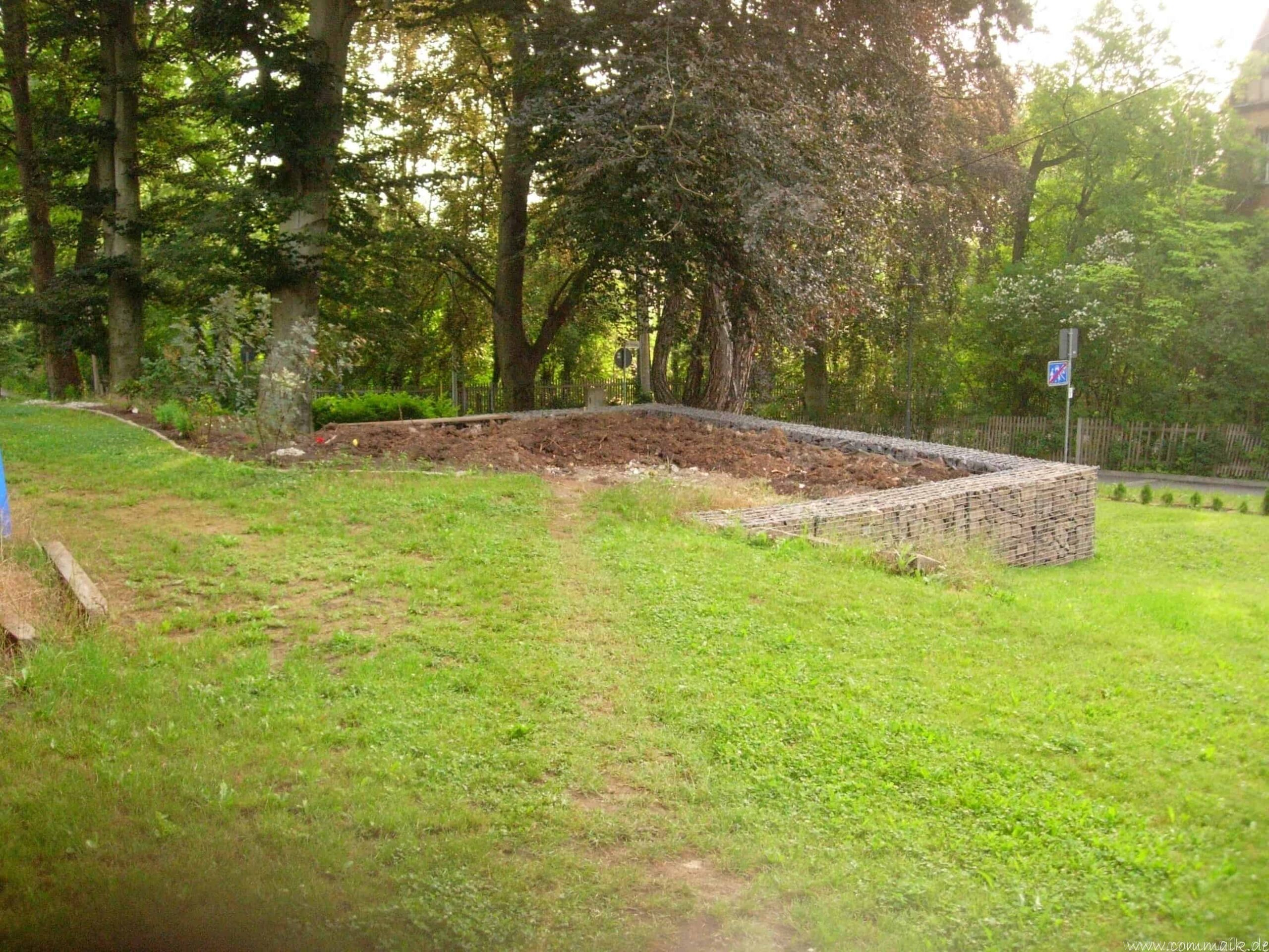 Durch die vielen kleinen Büsche und Heckenpflanzen und natürlich auch den Baum war das Erdreich sehr stark durchwurzelt. Effektiv haben wir mehr mit der Axt als der Schaufel gegraben. Eine Richtschnur grenzte die Grundfläche zunächst ein und gab einen groben Ansatz zur Einebnung. Kurioser Weise stellte sich heraus das wir auf ca. 15m Länge ein Gefälle von 2cm erbuttelt hatten – das ganze zunächst aber nur nach Sicht und ohne techn. Hilfsmittel.