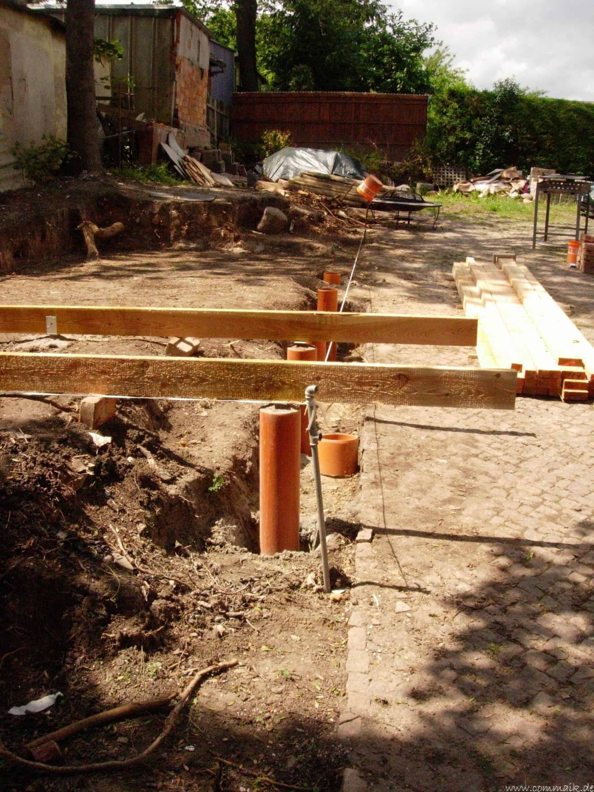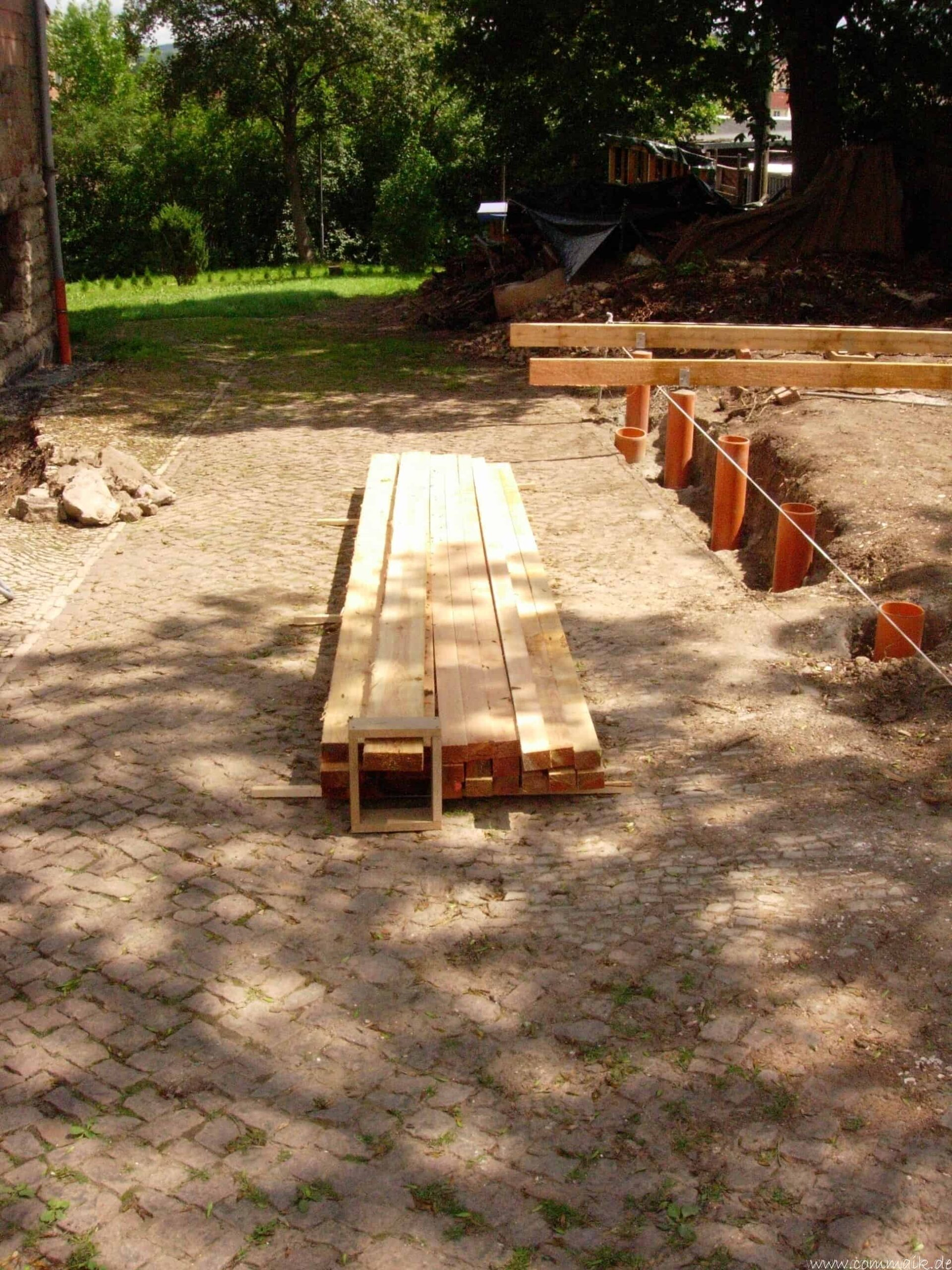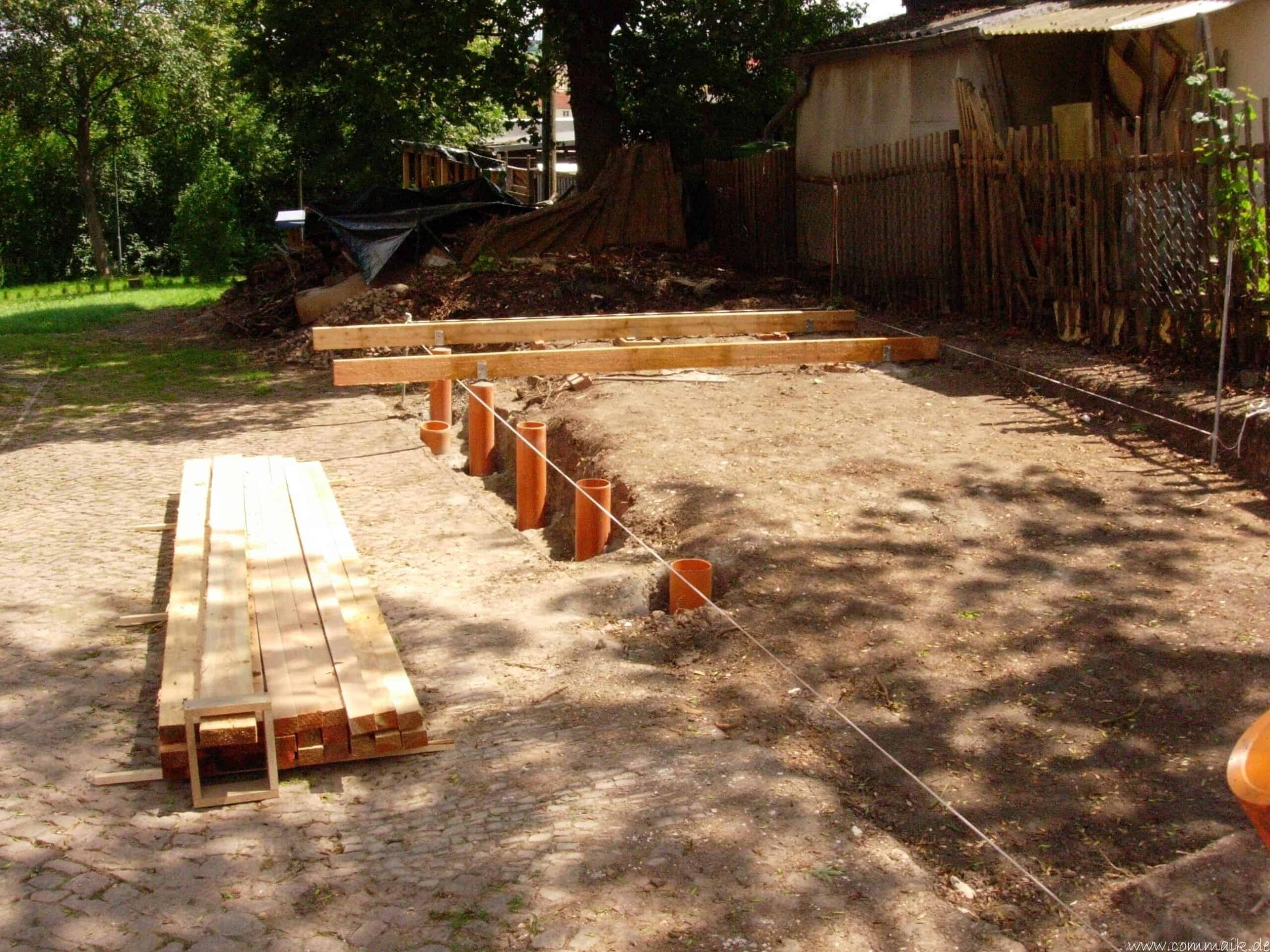 In der Grundform sollte die Terrasse links auf ca 10m-15m als Holzdeck angelegt werden. Dann sollte nach rechts ein Meter Pflasterweg folgen und schliesslich 3m betonierte Grundfläche für die Grillaufbauten und die Abstellfläche für die Wertstofftonnen. Zunächst begannen wir mit dem Holzdeck. Als Unterkonstruktion wurde heimische Lärche im Format 250×70 mm hochkant gewählt. Bei einer Breite von 3,50m wurden 3 Befestigungspunkte vorgesehen. Da das Plateau zum Haus hin abfällig war mußte ich mir etwas besonderes Ausdenken. Hier habe ich aus 100er KG Rohren jeweils eine Stützsäule gegossen. Die Rohre wurden hierzu auf 80cm in die Erde eingelassen und in der Höhe als auch Flucht ausgerichtet.Auf dem Plateau selbst wurden für die Tragfundamente 30x30cm und 80cm tiefe Löcher gegraben.
