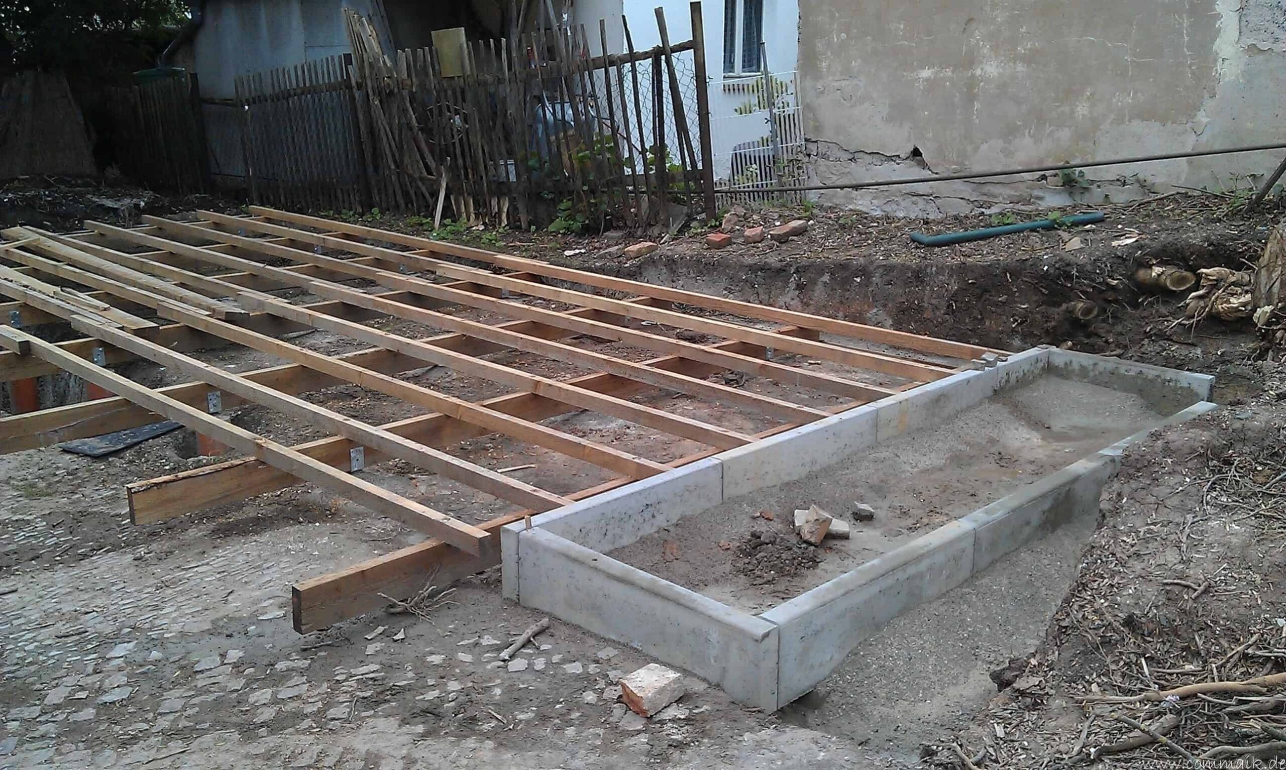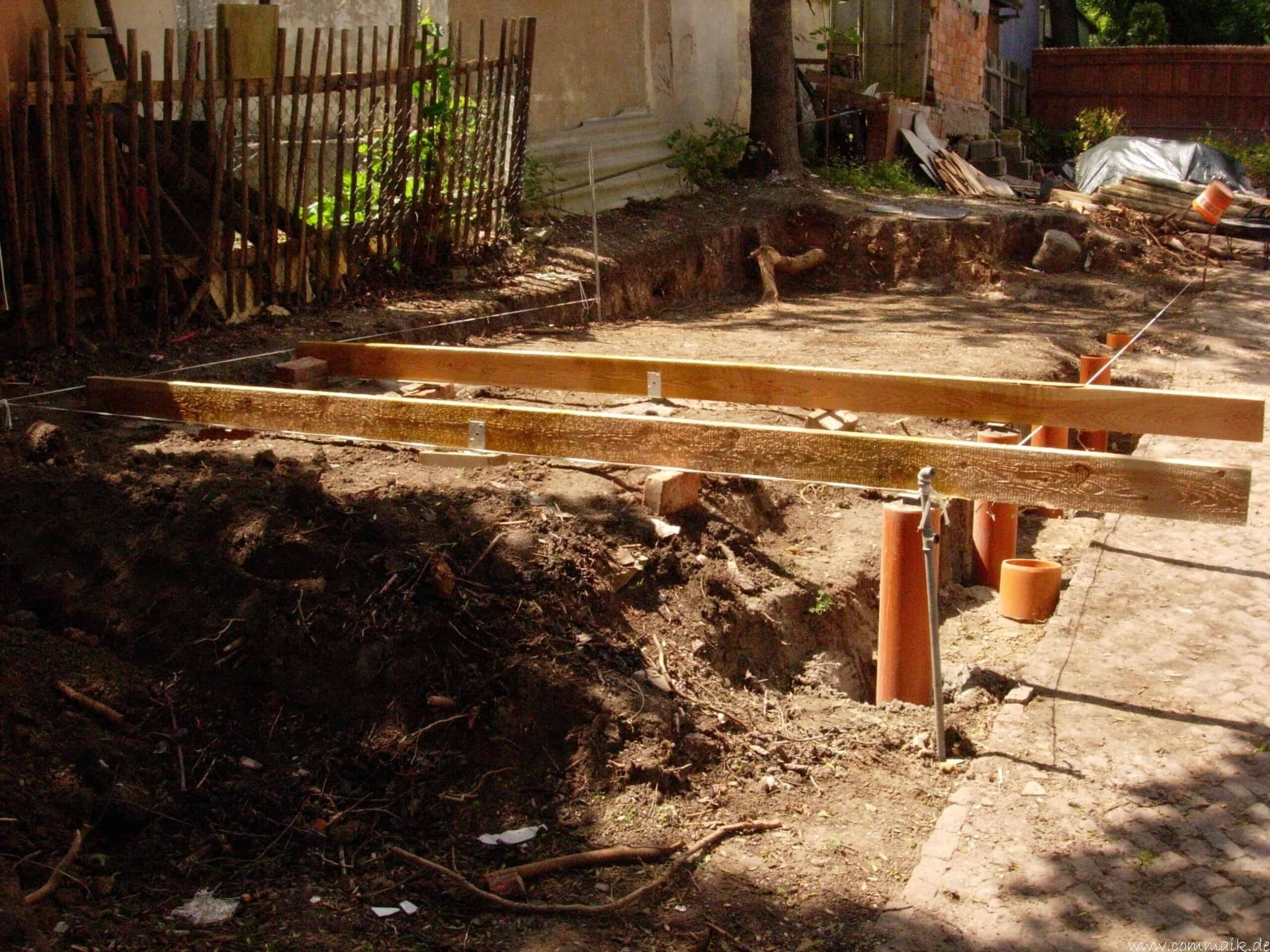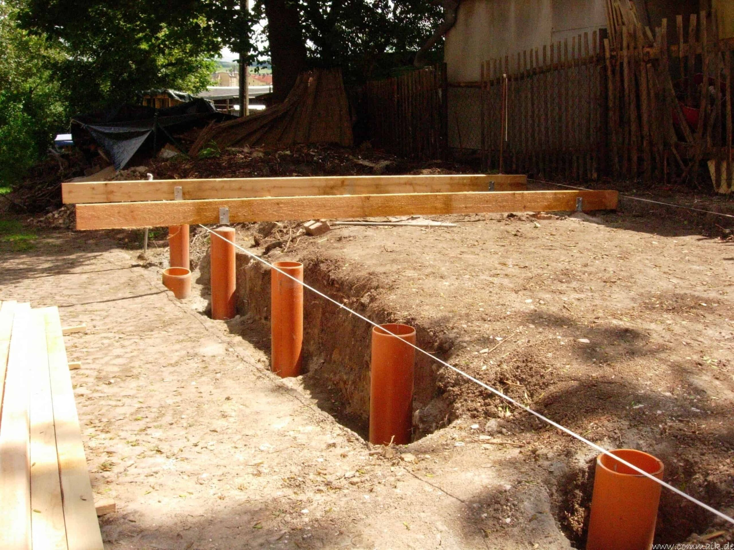 In der Grundform sollte die Terrasse links auf ca 10m-15m als Holzdeck angelegt werden. Dann sollte nach rechts ein Meter Pflasterweg folgen und schliesslich 3m betonierte Grundfläche für die Grillaufbauten und die Abstellfläche für die Wertstofftonnen. Zunächst begannen wir mit dem Holzdeck. Als Unterkonstruktion wurde heimische Lärche im Format 250×70 mm hochkant gewählt. Bei einer Breite von 3,50m wurden 3 Befestigungspunkte vorgesehen. Da das Plateau zum Haus hin abfällig war mußte ich mir etwas besonderes Ausdenken. Hier habe ich aus 100er KG Rohren jeweils eine Stützsäule gegossen. Die Rohre wurden hierzu auf 80cm in die Erde eingelassen und in der Höhe als auch Flucht ausgerichtet.Auf dem Plateau selbst wurden für die Tragfundamente 30x30cm und 80cm tiefe Löcher gegraben.