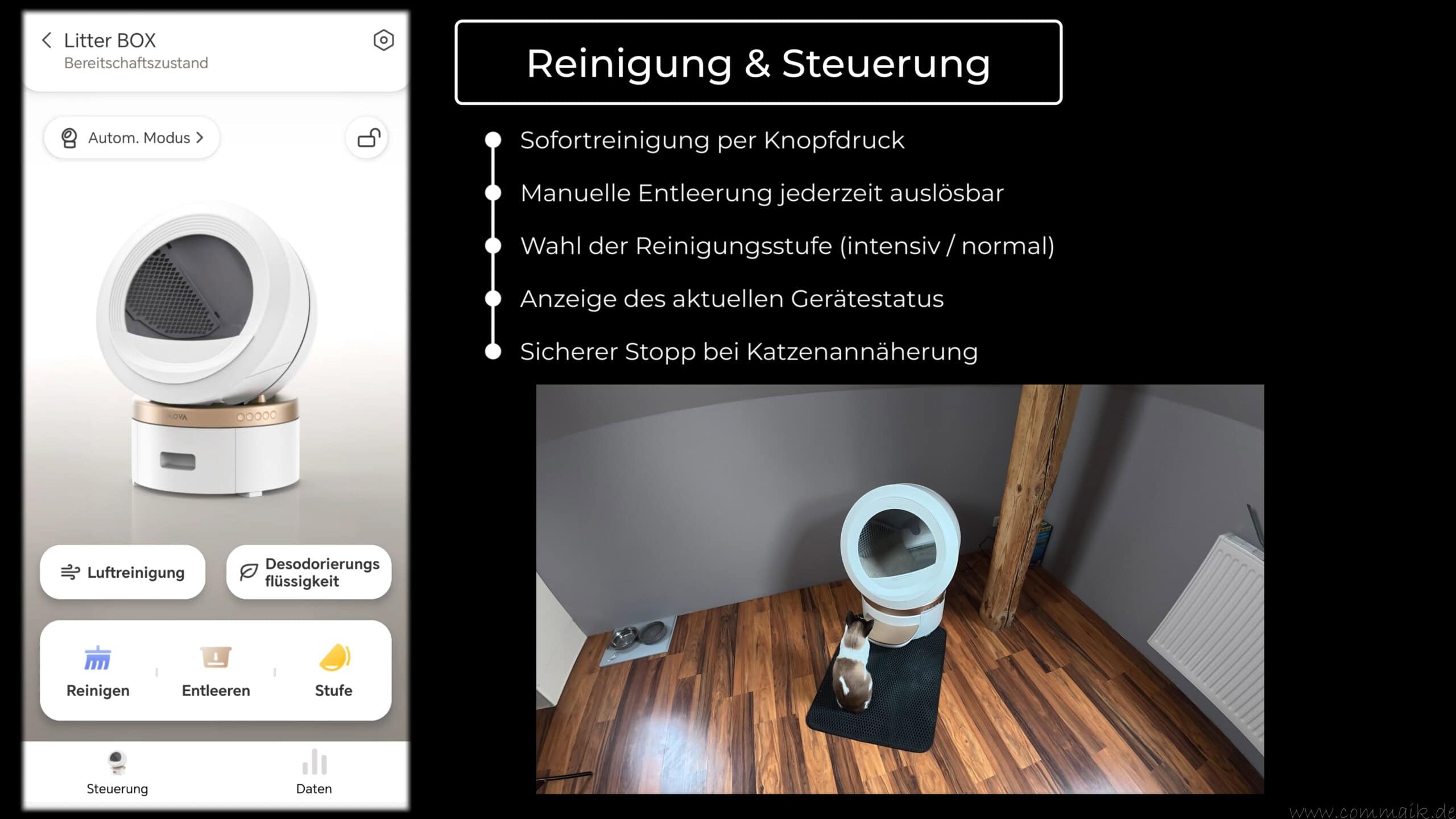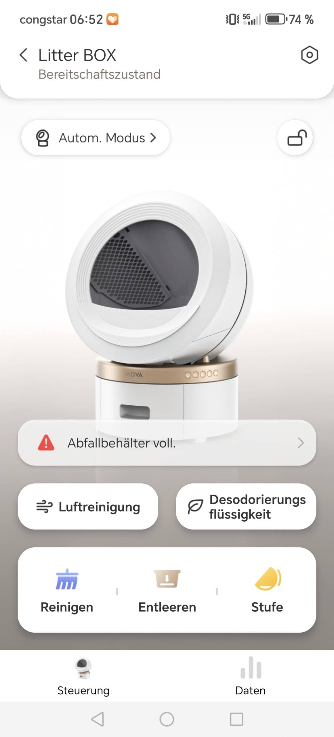 Die App ist ein zentraler Bestandteil des Gesamtsystems und übernimmt die vollständige Steuerung der selbstreinigenden Katzentoilette. Sie ist übersichtlich aufgebaut und gliedert sich logisch in Statusanzeige, Steuerungsfunktionen, Statistiken und Geräteeinstellungen. Ein manuelles Eingreifen am Gerät selbst ist im Alltag kaum notwendig.