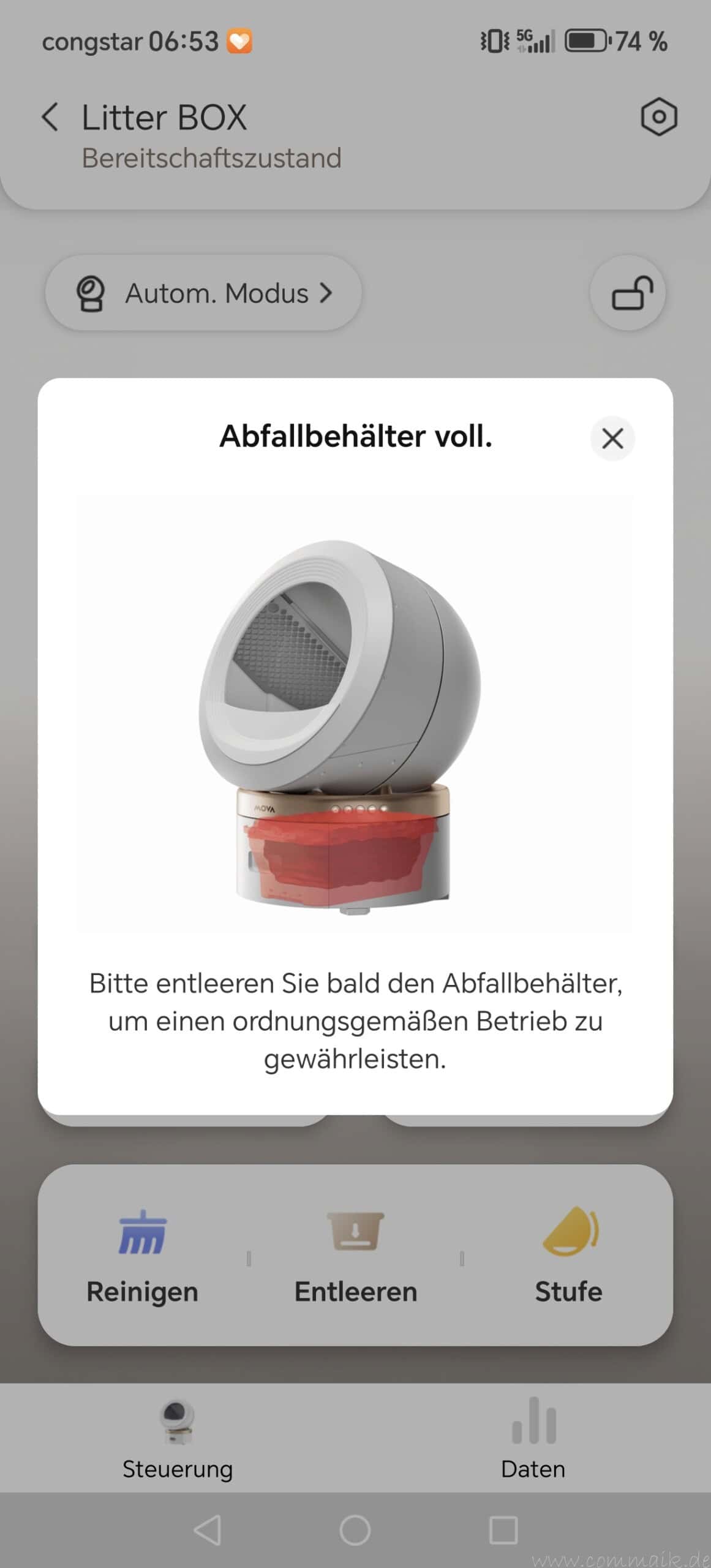 Ebenfalls sichtbar sind Statusmeldungen zu Streu, Abfallbehälter und Geruchsneutralisation. Der Füllstand der Katzentoilette wird überwacht und bei Bedarf über Push-Benachrichtigungen gemeldet.