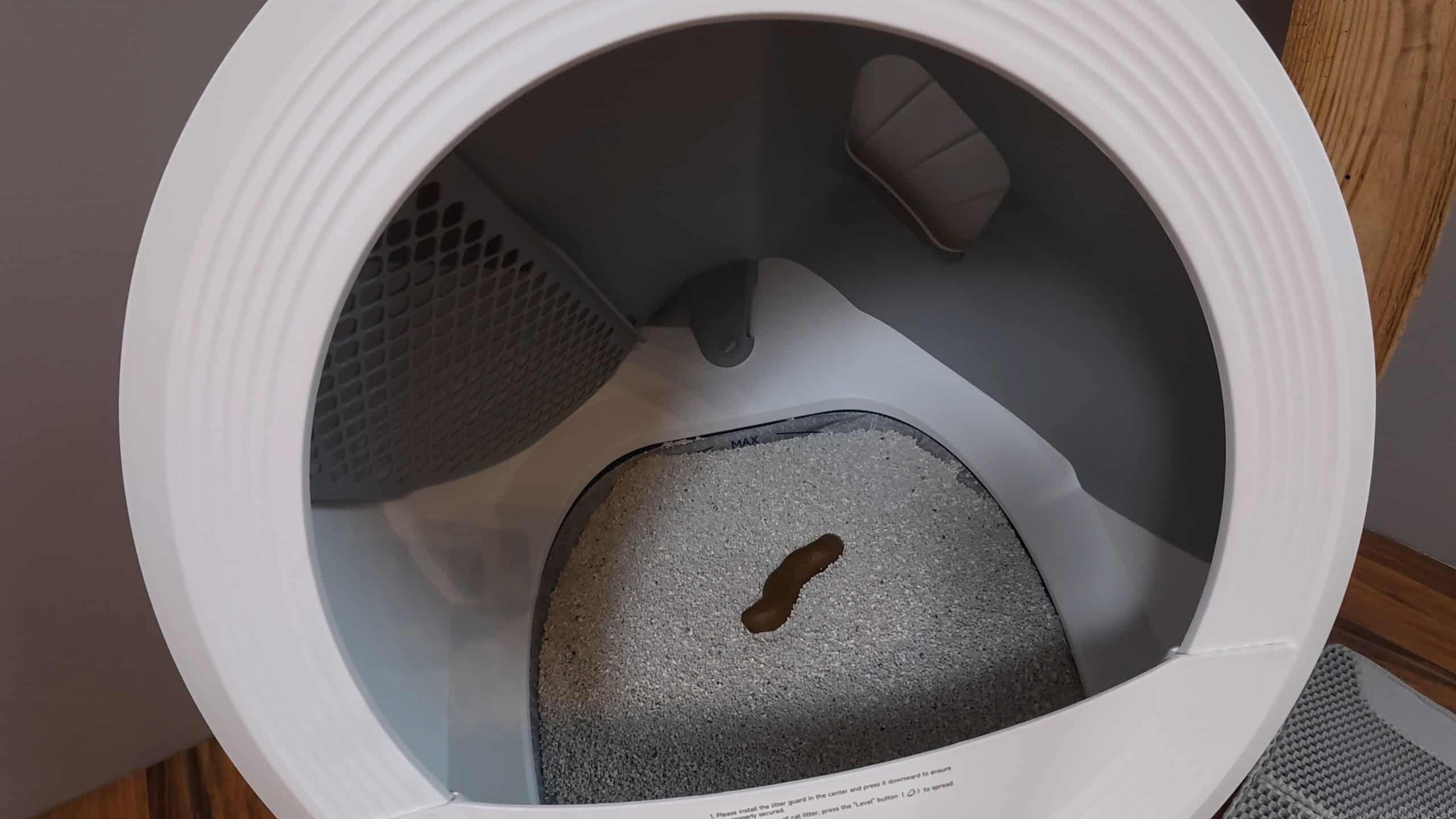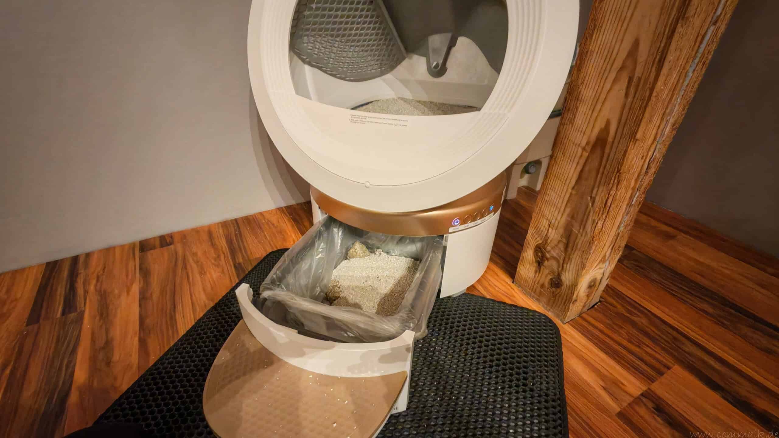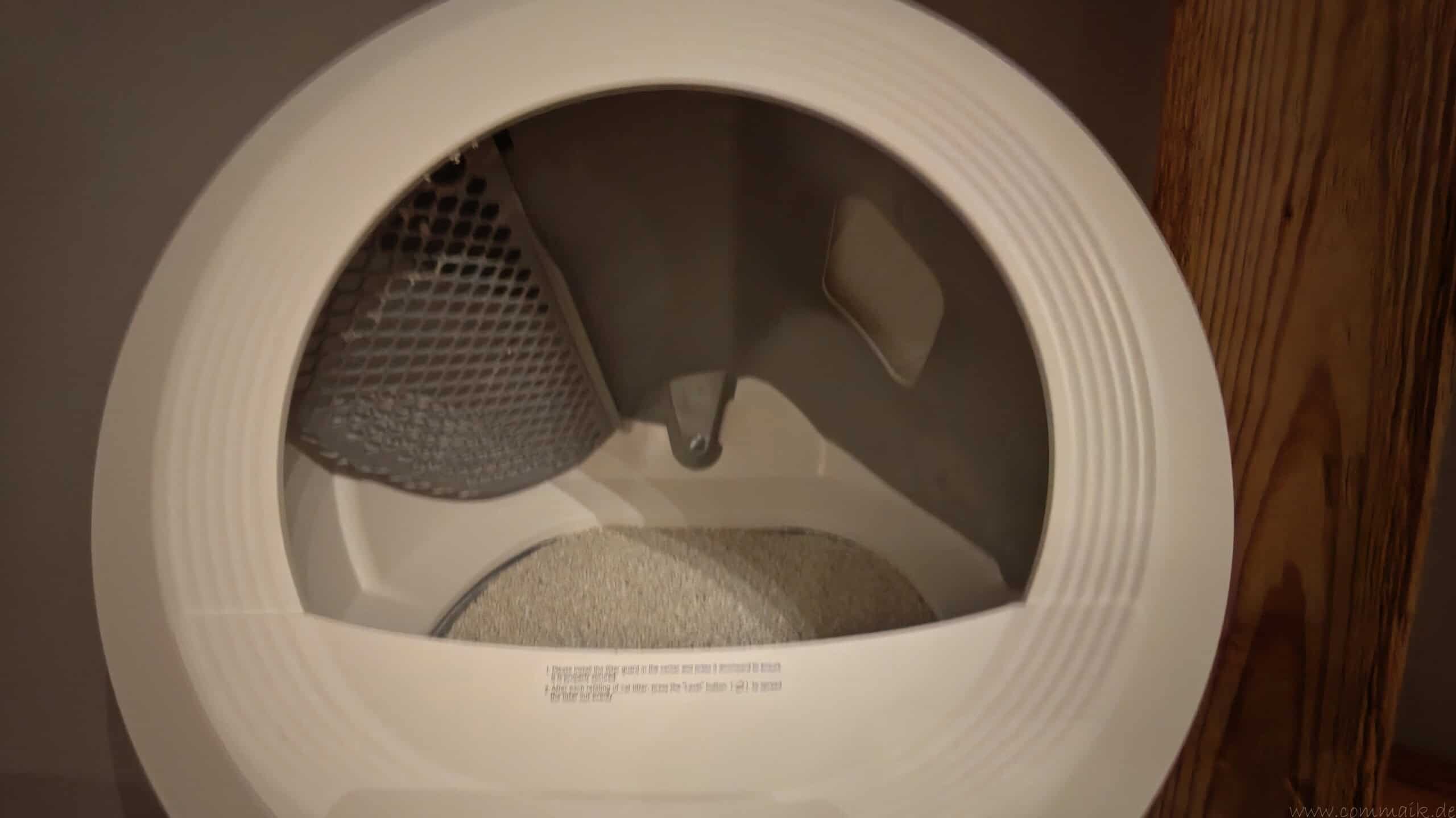 Der Abfallbehälter fasst rund 11 Liter und ist für eine Nutzung von bis zu 15 Tagen ausgelegt. In der Praxis hängt die tatsächliche Laufzeit stark von der Anzahl der Katzen und deren Nutzungsverhalten ab. Mit unseren beiden Katzen kommen wir effektiv etwa eine Woche aus, bevor die App erstmals den Wechsel des Abfallbehälters meldet. Dieser Hinweis erfolgt zuverlässig per Push-Benachrichtigung, sodass ein Überfüllen vermieden wird.