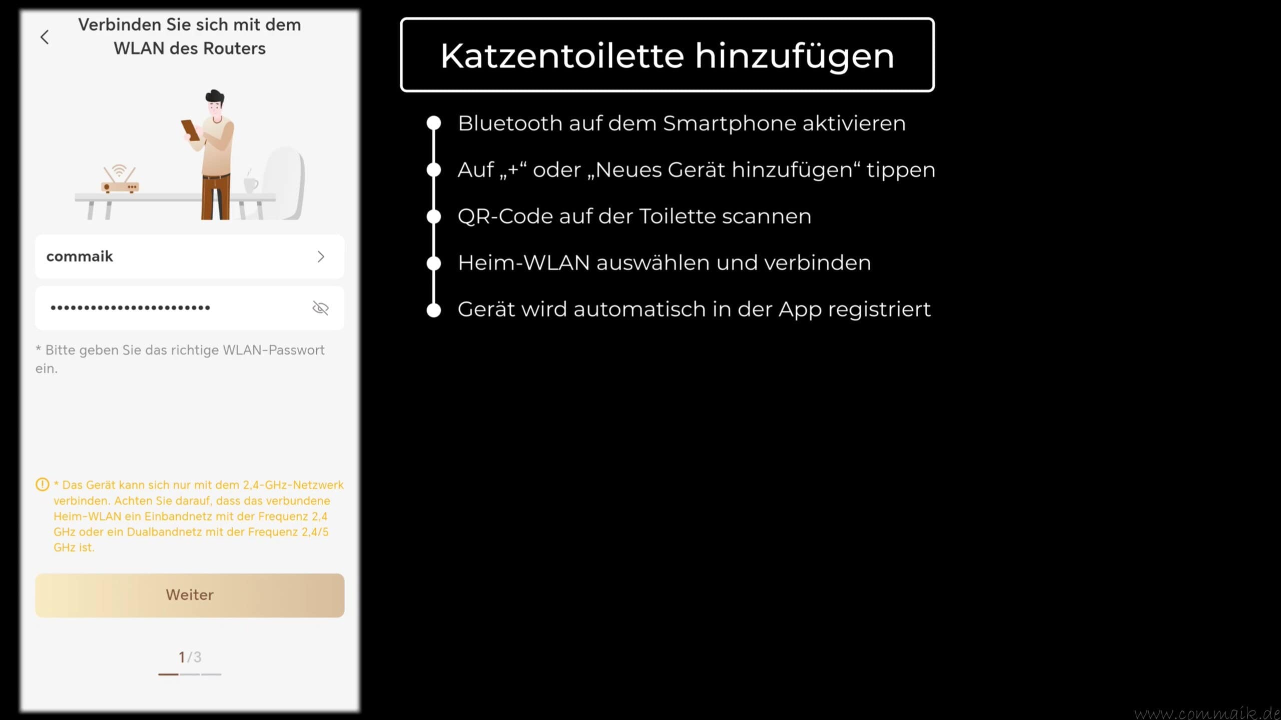 Anschließend erfolgt die Verbindung mit dem heimischen WLAN. Das automatische Katzenklo nutzt das 2,4-GHz-Frequenzband, was eine stabile Verbindung und eine hohe Reichweite ermöglicht. Nach Eingabe der WLAN-Daten verbindet sich das Gerät selbstständig mit dem Netzwerk und wird in der App registriert.