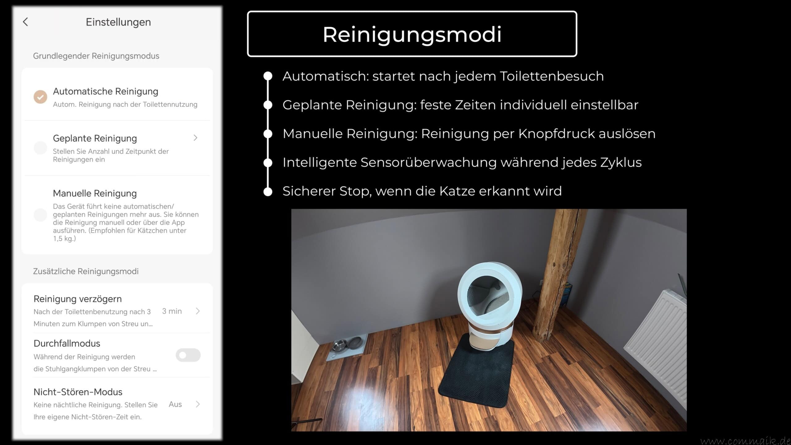Über die App lassen sich sämtliche Reinigungsmodi konfigurieren. Dazu gehören die automatische Reinigung nach dem Toilettengang, geplante Reinigungszeiten sowie die manuelle Reinigung per Knopfdruck. Zusätzlich können Sondermodi wie der Durchfallmodus oder der Nicht-Stören-Modus aktiviert werden.