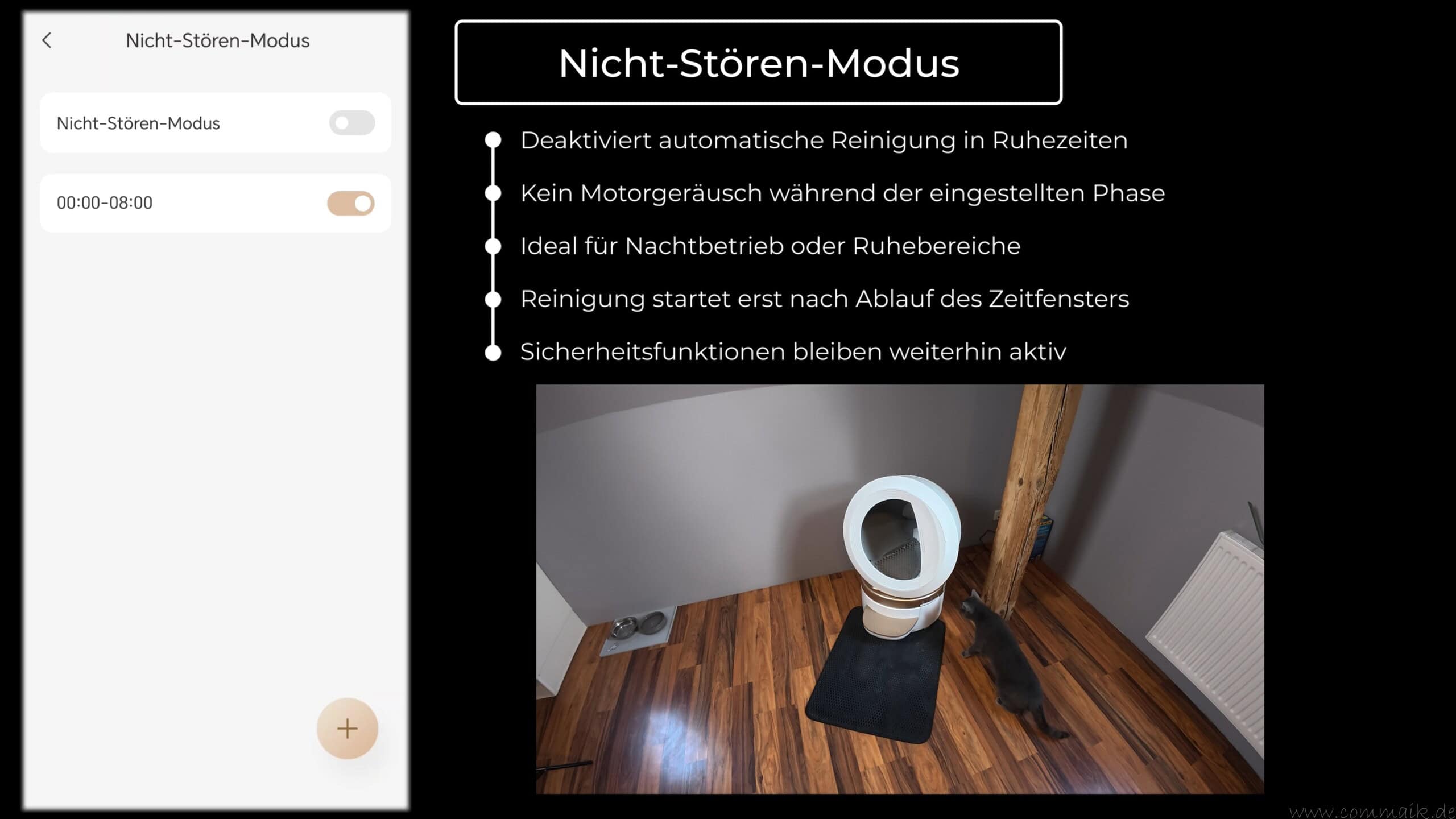 Im Nicht-Stören-Modus bleibt die Trommel während definierter Zeiträume vollständig inaktiv. Das ist besonders für den Nachtbetrieb oder bei Aufstellung in ruhigen Wohnbereichen sinnvoll. Nach Ablauf der Ruhezeit setzt die Katzentoilette den Reinigungsvorgang automatisch fort.