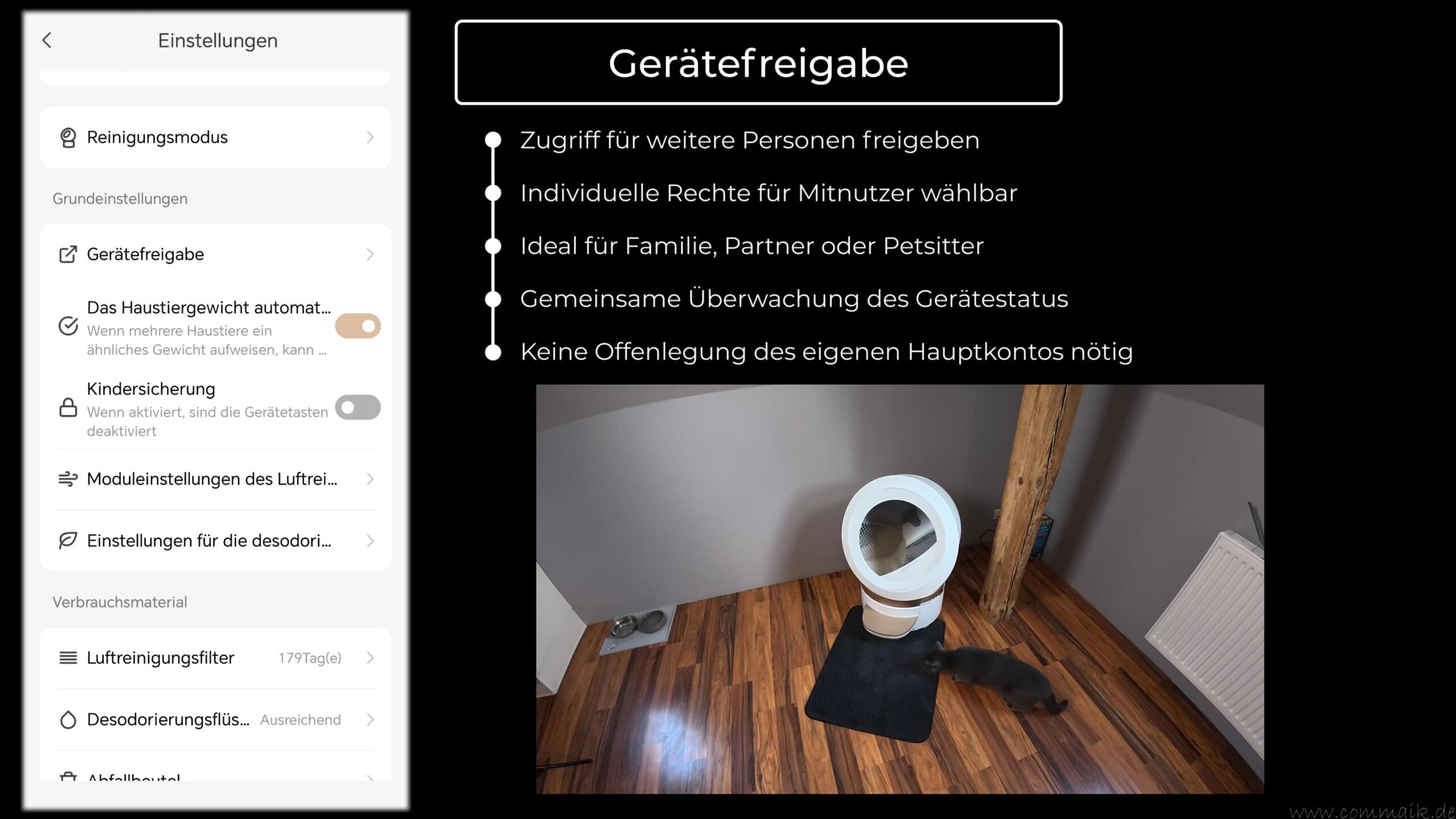 Die App unterstützt die Freigabe des Geräts für mehrere Nutzer. So können weitere Personen Zugriff auf die Katzentoilette erhalten, etwa Familienmitglieder oder Betreuungspersonen. Die Steuerung erfolgt dabei über separate Konten, ohne dass das Hauptkonto weitergegeben werden muss.