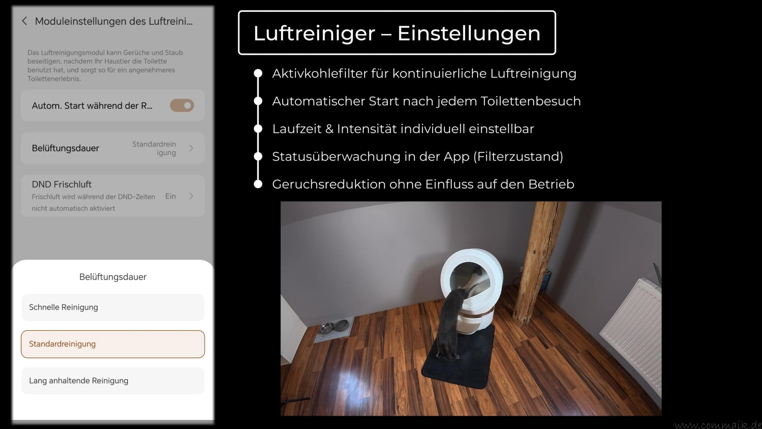 Durch die Kombination aus geeignetem Katzenstreu und flexibel wählbaren Reinigungsmodi lässt sich der Reinigungszyklus gezielt an die individuellen Anforderungen im Alltag anpassen, ohne die grundlegende Funktionsweise des Systems zu beeinträchtigen.