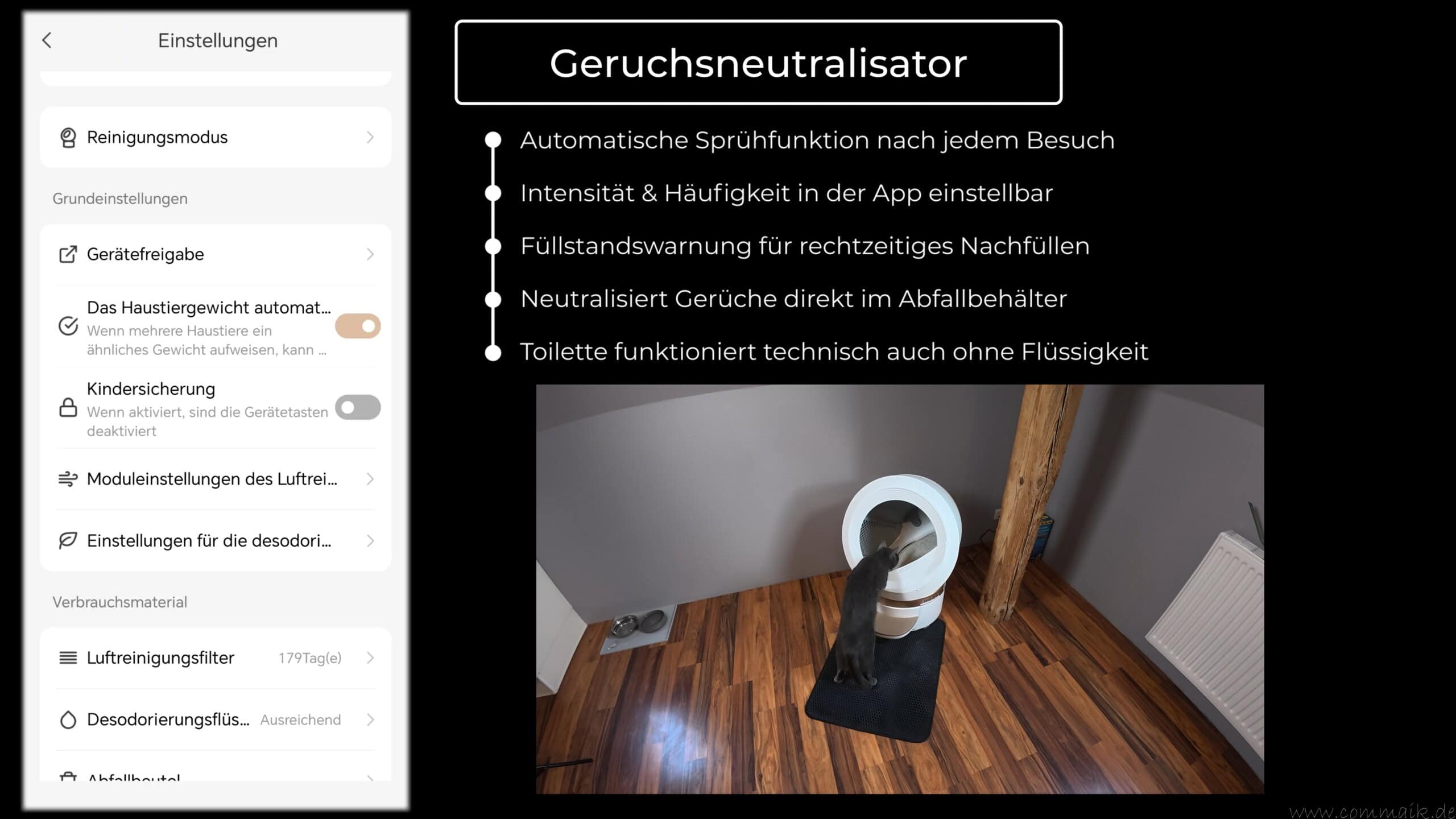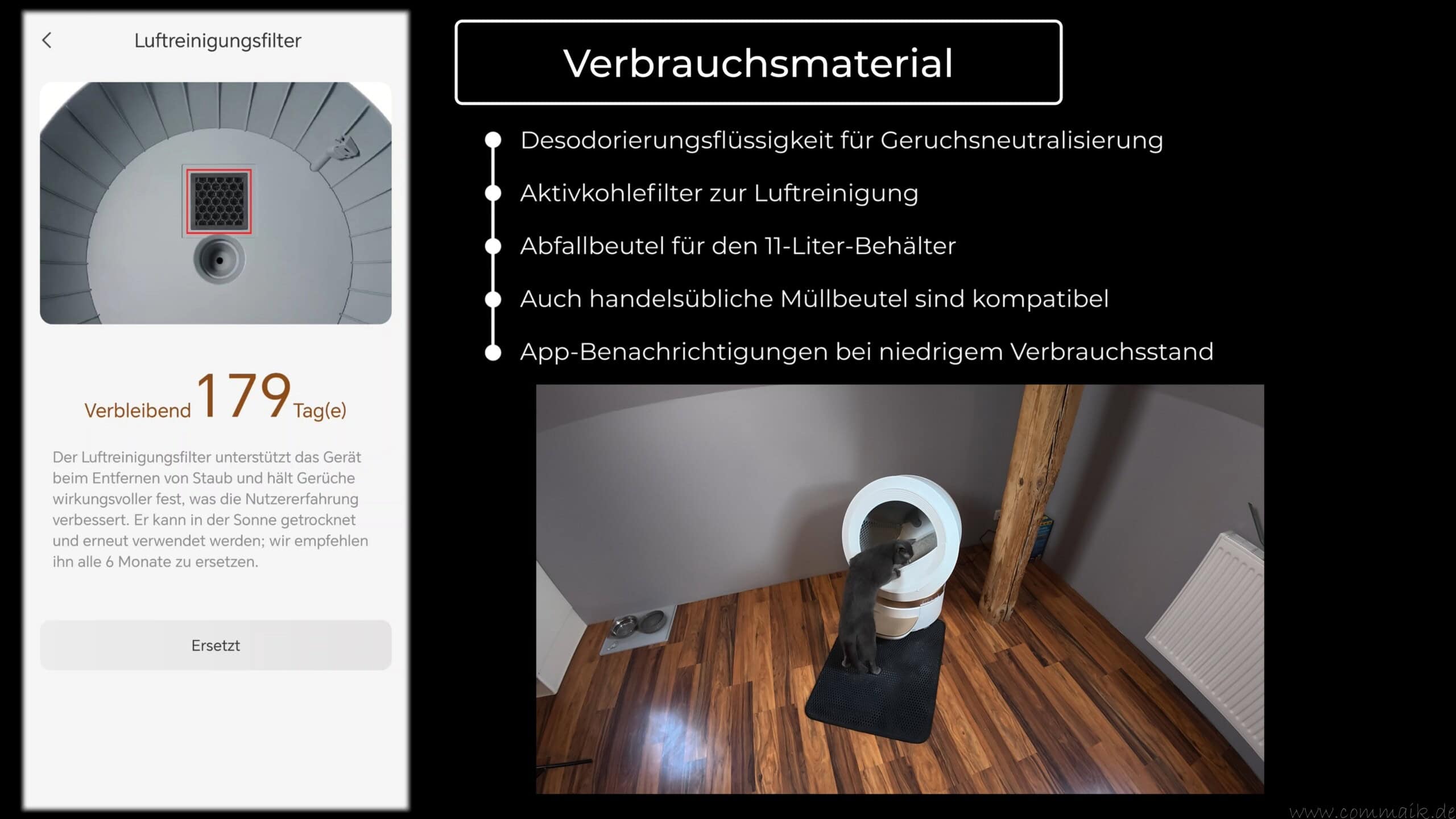 | Verbrauchsmaterial | Aktivkohlefilter, Abfallbeutel, Katzenstreu |