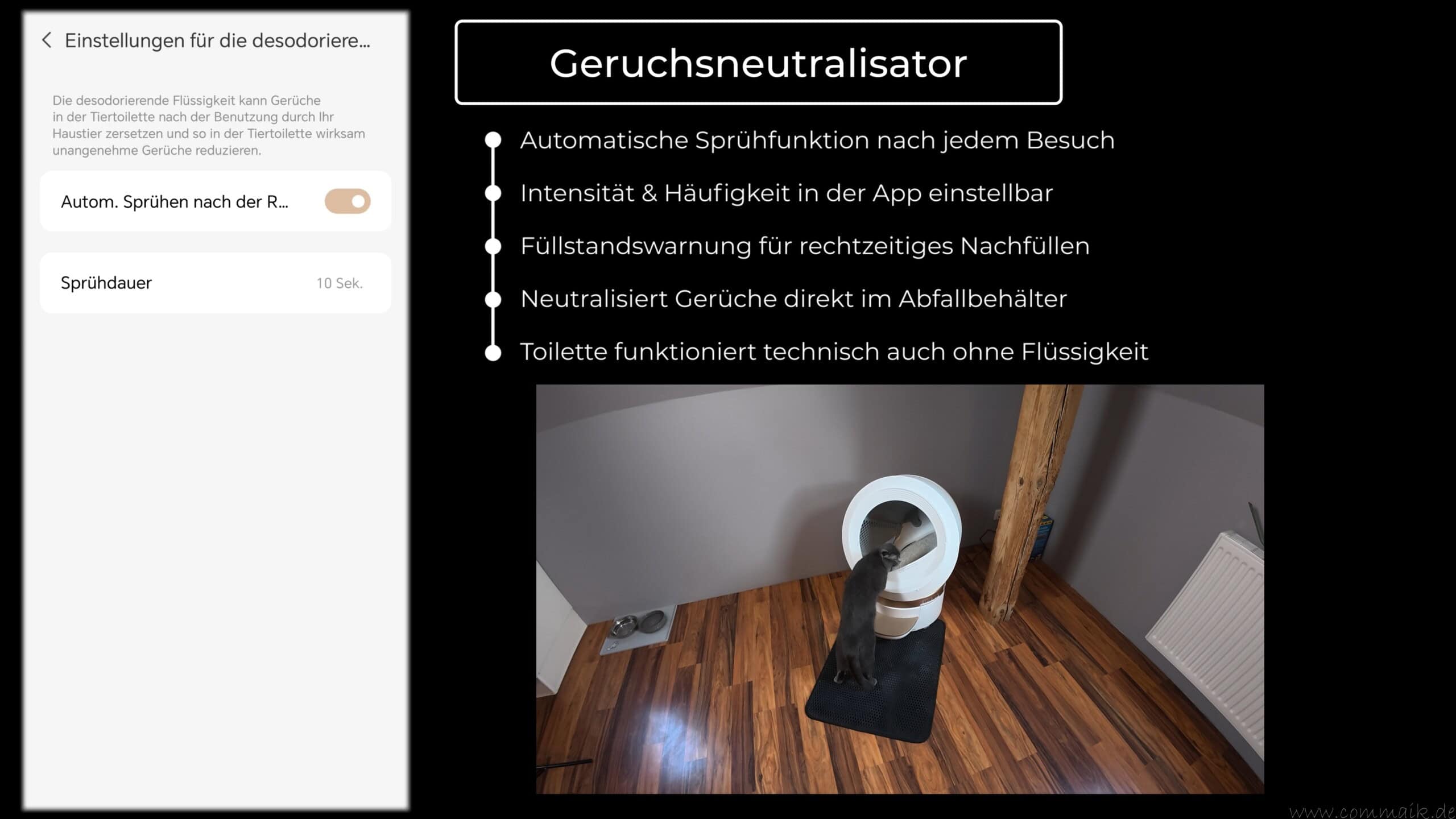 Die App ermöglicht außerdem die Steuerung der Geruchskontrolle. Hier lassen sich Intensität und Auslösung der Desodorierung, also Geruchsneutralisation, anpassen. Der Status der Desodorierungsflüssigkeit und des Aktivkohlefilters wird überwacht, sodass rechtzeitig auf einen niedrigen Füllstand hingewiesen wird. Wichtig ist dabei, dass die Katzentoilette technisch auch ohne eingesetzte Flüssigkeit weiterhin funktionsfähig bleibt. Durch diese Funktion hat sich der typische Geruch einer Katzentoilette deutlich reduziert.