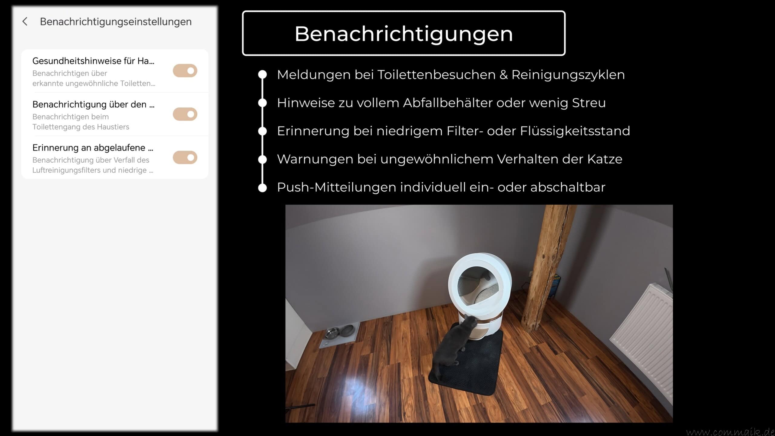 Push-Benachrichtigungen informieren über wichtige Ereignisse, etwa abgeschlossene Reinigungszyklen, einen vollen Abfallbehälter oder niedrigen Füllstand von Streu oder Filter. Auch ungewöhnliche Nutzungsprofile oder Abweichungen im Verhalten der Katze können gemeldet werden. Alle Benachrichtigungen lassen sich individuell aktivieren oder deaktivieren.