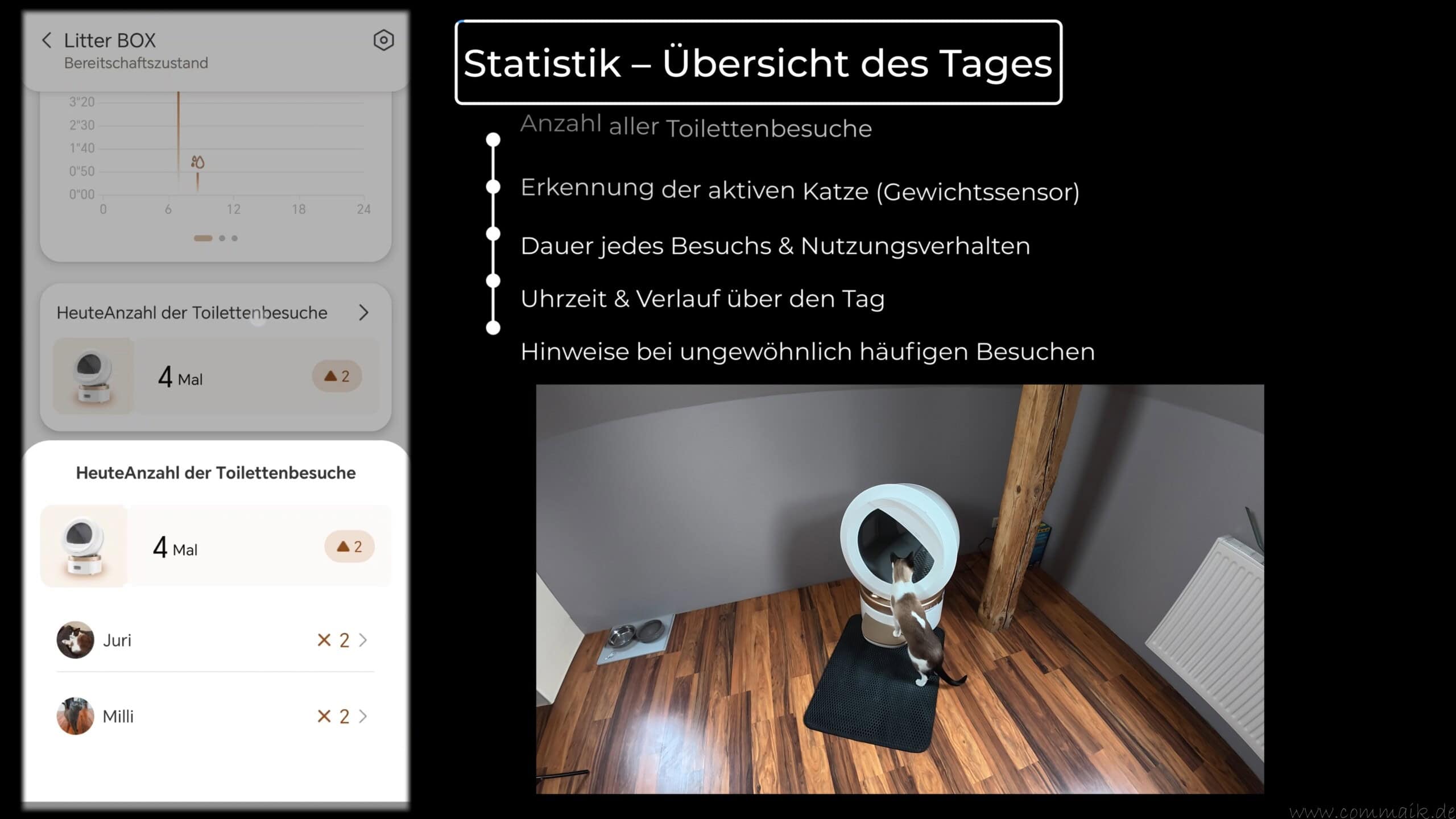 Durch die integrierte Gewichtserkennung können die Toilettengänge einzelnen Katzen zugeordnet werden. Auf diese Weise entsteht ein langfristiger Überblick über Nutzungsverhalten und Gewichtsentwicklung. Veränderungen lassen sich frühzeitig erkennen, was insbesondere bei mehreren Katzen oder gesundheitlichen Auffälligkeiten hilfreich sein kann.